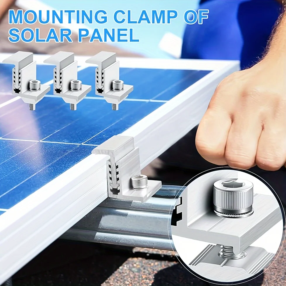 ExquisiteWorkmanship:SolarPanelAdjustableEndClampsWithAccurateDesign,ZAdjustableMountingBracketsCanWorkFor50wTo150wPanels,BanMakeTheConnectionBetweenThePanelFirmly,AndTheAluminumFramedPanelClampsForFixingPanelOnTheRails