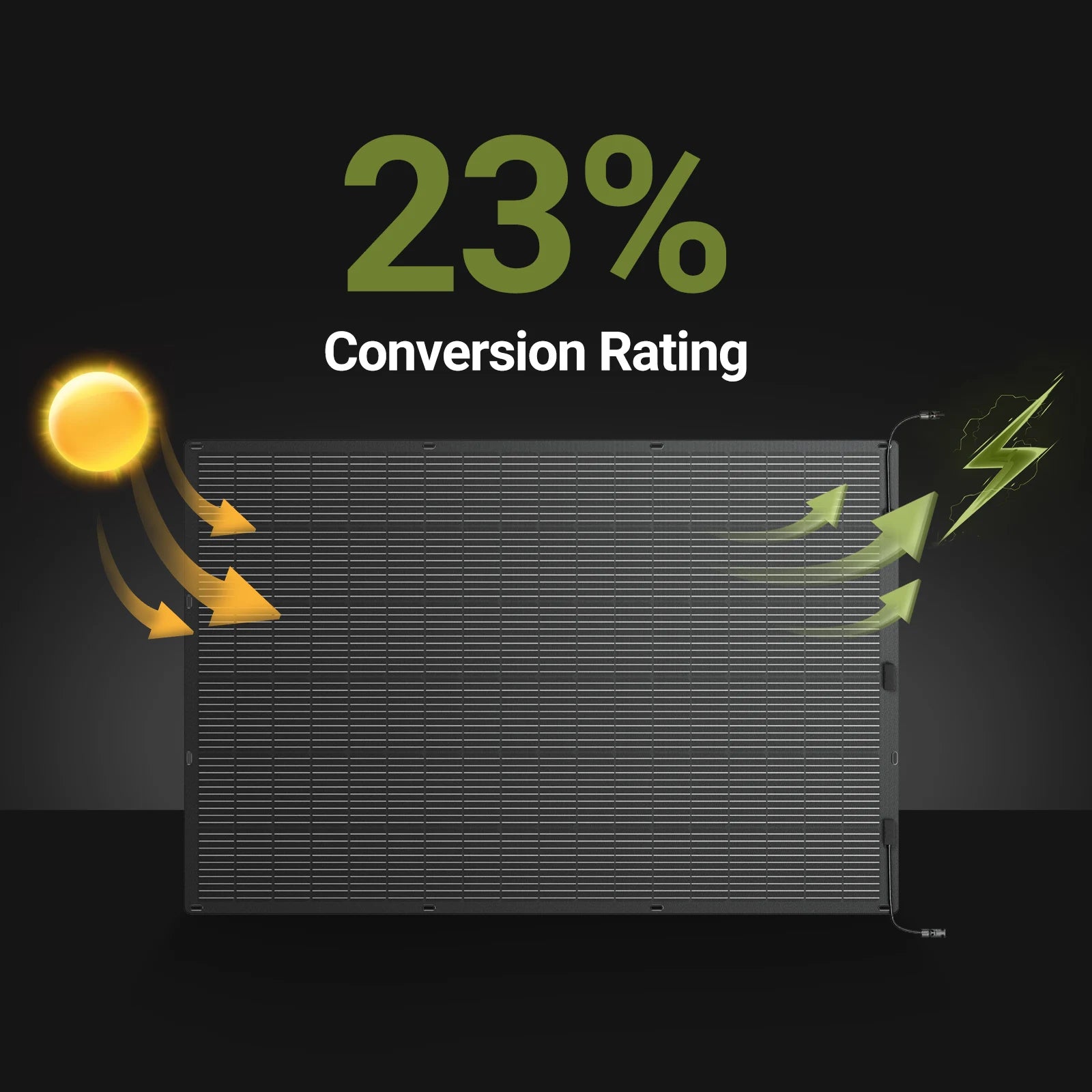 【High conversion efficiency】The SF400 400W flexible solar panel uses advanced monocrystalline solar cells and achieves a conversion efficiency of up to 25%. With honeycomb ETFE used on the surface to collect sunlight from different angles, also providing higher light transmittance and longer lifespan, you can get more green power and longer time.