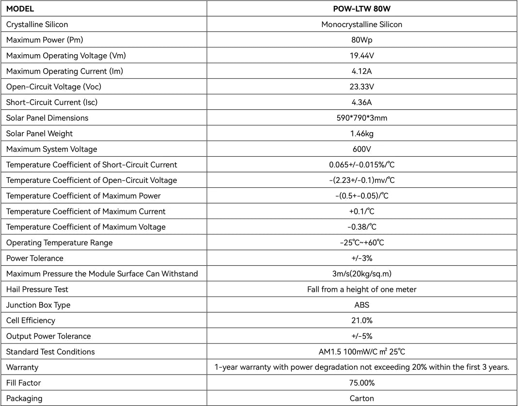 Translucent: PowMr's 80-watt flexible solar modules are made of high-strength monocrystalline silicon that is corrosion-, heat-, and water-resistant. They are highly translucent, heat resistant and can be used outdoors for long periods of time.