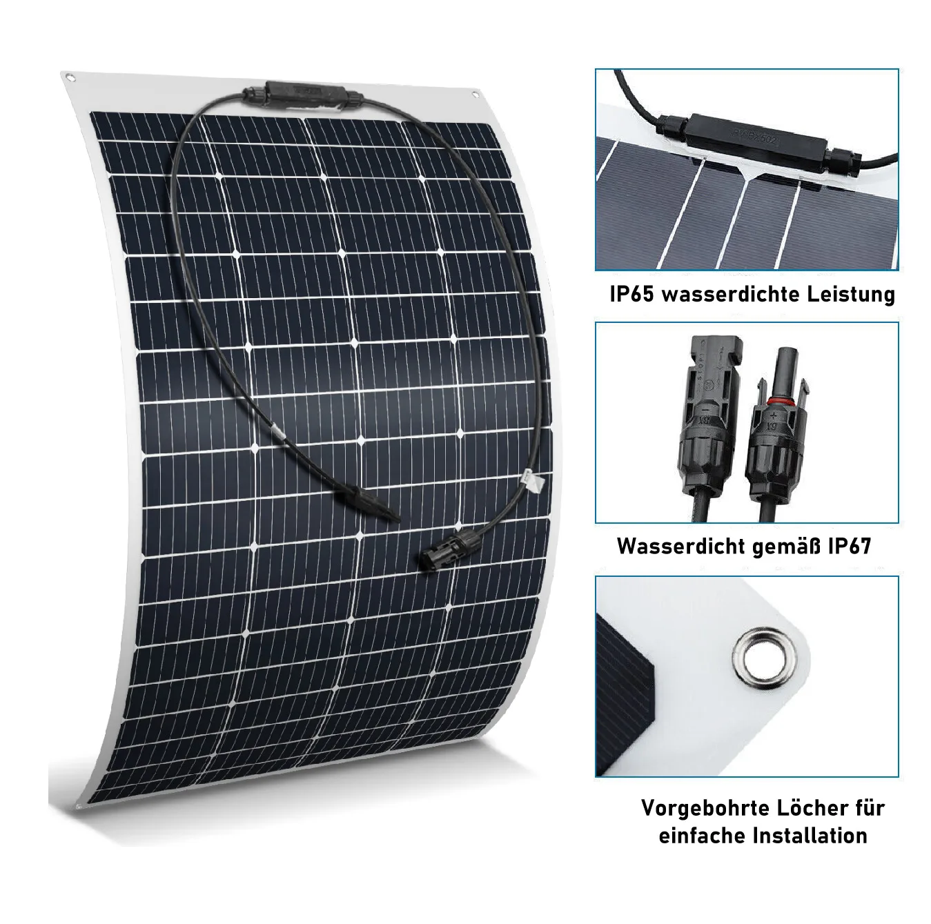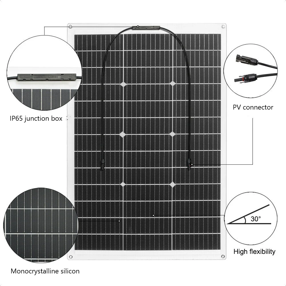 EASY TO INSTALL AND USE: Universal solar connectors and eyelets around the product allow for hooks to be hung and panels to be glued to the mounting surface. It can be mounted on trailers, boats, bungalows, tents, cars, trucks, yachts, roofs or any other irregular surface.