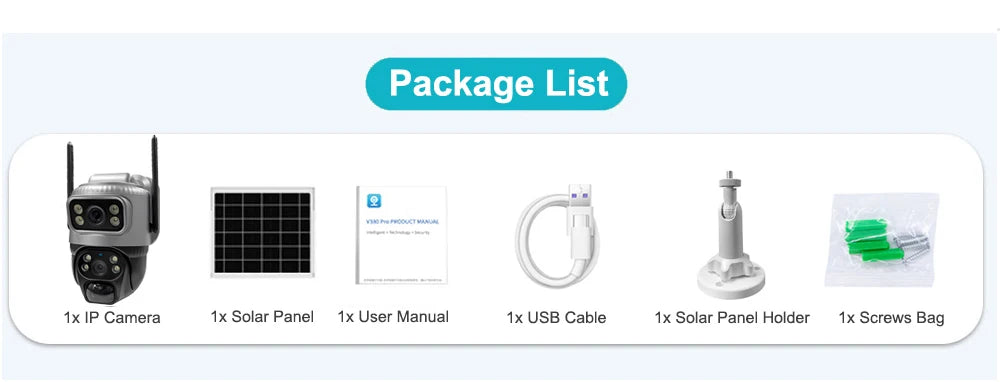 1 x Solar Camera, 1 x Solar Panel, 1 x User Manual, 1 x USB Cable, 1 x Solar Panel Holder, 1 x Screws Package